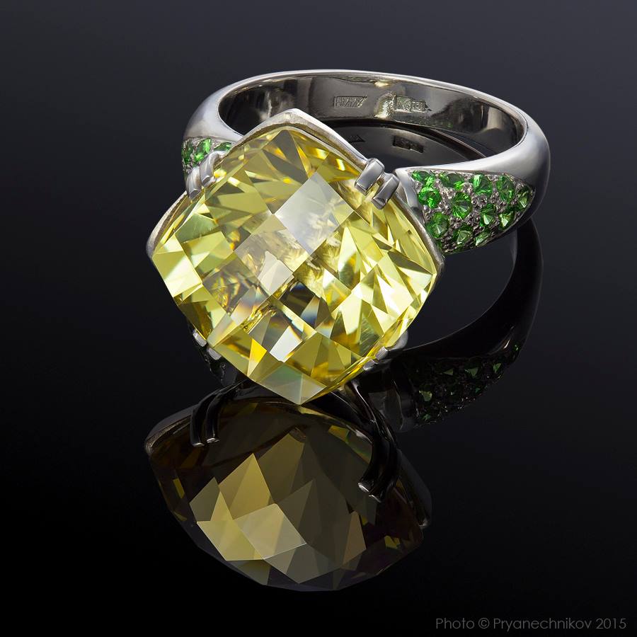 Кольцо из белого золота 750°, Цитрин , цавориты