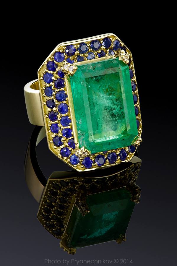 Кольцо с изумрудом и синими сапфирами.