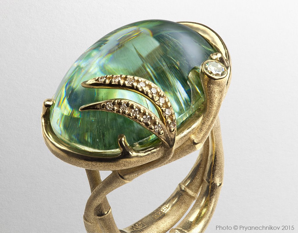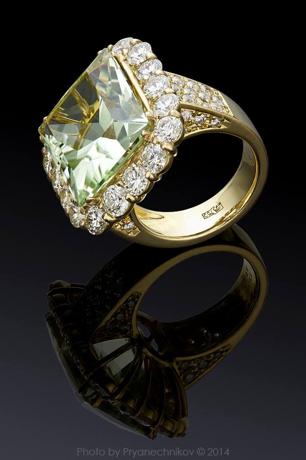 Кольцо с желто-зеленым бериллом и бриллиантами.