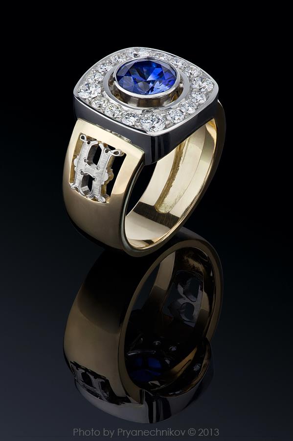 Кольцо. Мужское. Сапфир, бриллианты