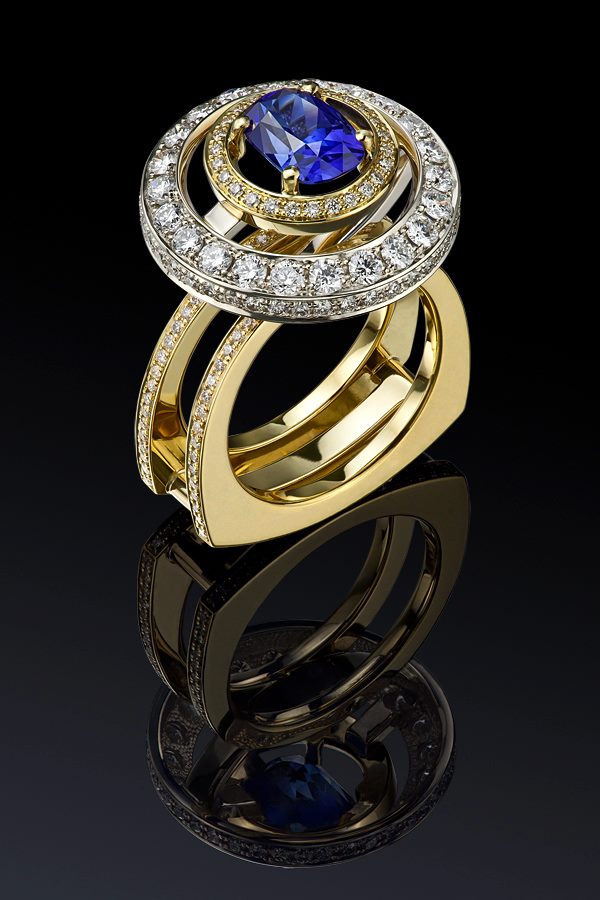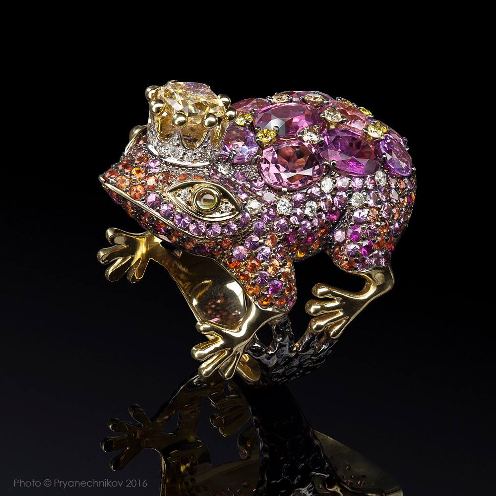 Кольцо. Золото, жёлтые, белые и чёрные бриллианты, розовые и оранжевые сапфиры, рубеллиты